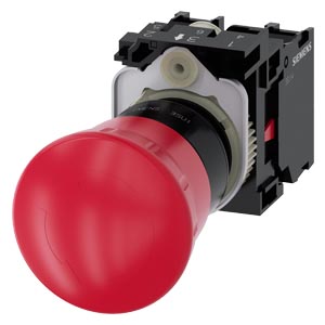 PULSADOR SETA DE PARO EMEG., 22MM, REDONDO, PLASTICO, ROJO, 40MM, SOSTENIDO, ENCLAVAMIENTO FORZADO, DESENCLAVAMIENTO POR GIRO, SIN PLACA DE FONDO AMARILLA, CON SOPORTE, 1NC, 1NC, BORNES DE TORNILLO. SIEMENS